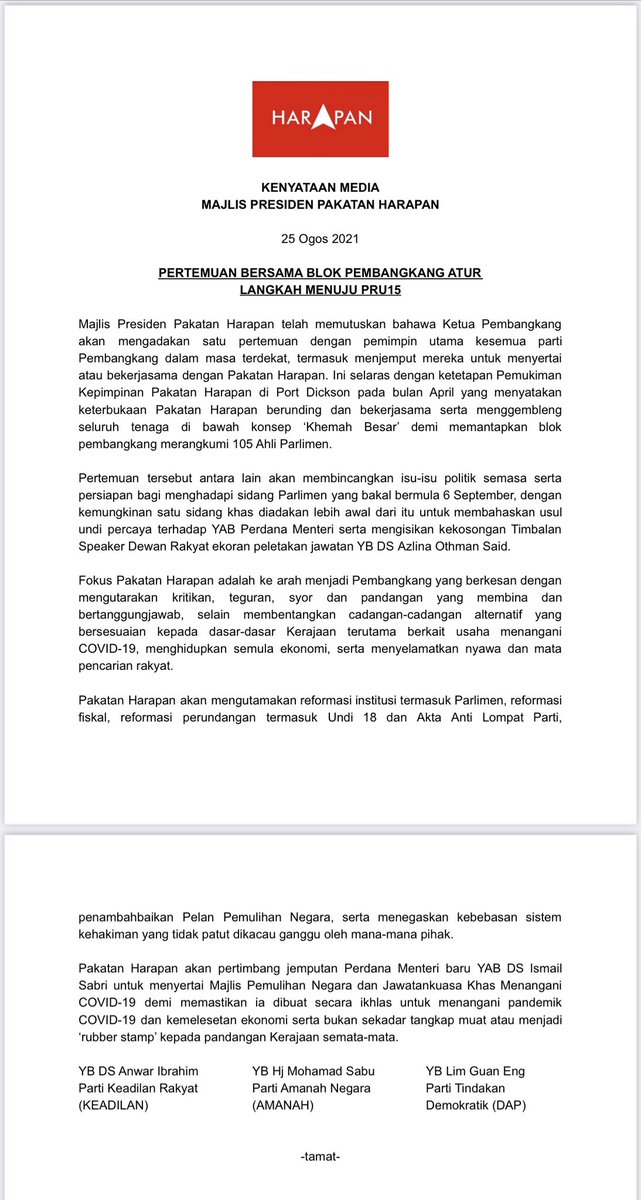 Anwar Ibrahim On Twitter Kenyataan Media Majlis Presiden Pakatan Harapan 25 Ogos 2021 Pertemuan Bersama Blok Pembangkang Atur Langkah Menuju Pru15 Https T Co Vgqliyyssm Twitter